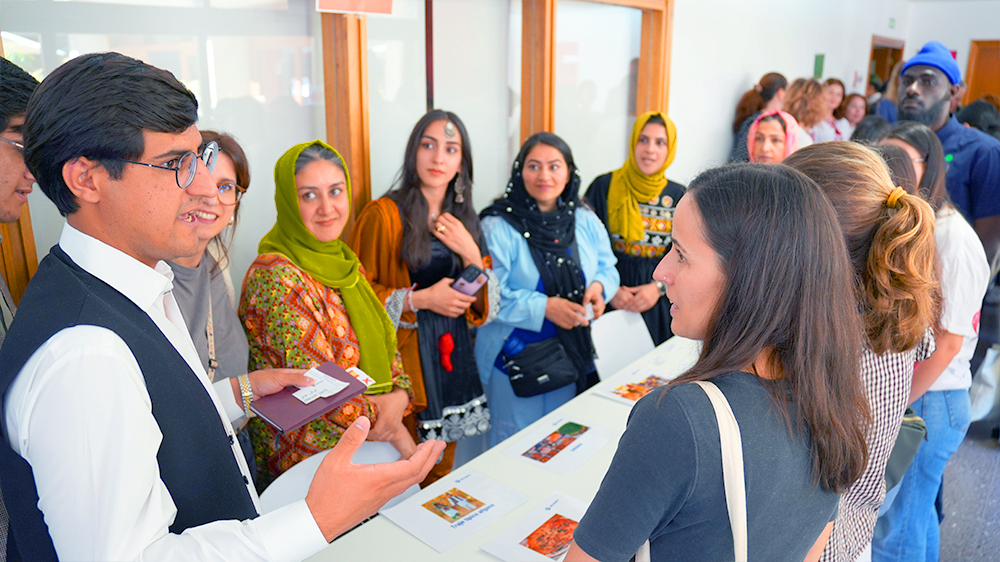 Una de las actividades programas en el Día del Español, Geografías del encuentro: culturas que unen, distribuyó ocho mesas en el claustro con información de Ucrania, Afganistán, Mali, Gambia, Palestina, Somalia, Nigeria y Venezuela. La afgana Ziba Wayizee fue una de las más activas durante toda la jornada, y declaró su felicidad por participar, un sentimiento que expresaron todos sus compañeros en esta iniciativa en la que participaron profesores y usuarios de Accem de Madrid, Azuqueca, Cabanillas del Campo, Pozuelo de Alarcón y Guadalajara. Un total de 69 aprendientes de español y 16 profesores, en una comunión total.
