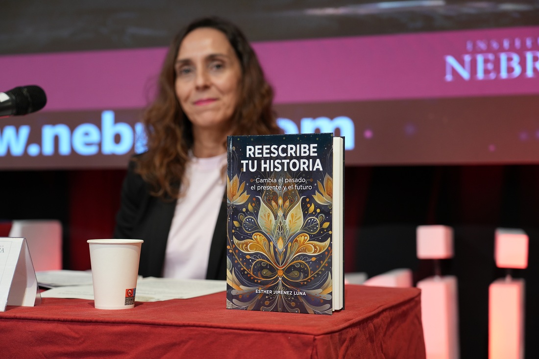 Complementó las palabras de Carballal, Esther Jiménez, profesora del Instituto Nebrija del Español: “Mi carrera me ha enseñado que las palabras no solo describen el mundo, sino que tienen la capacidad de crearlo. El lenguaje es la arquitectura de nuestra realidad”.  Para reescribir nuestras historias personales, propuso que cada uno recuperase su autoridad como autor. “Todos tenéis el poder de la palabra para crear en vuestra mente, mediante la visualización, el pensamiento y el sentimiento, la vida que realmente deseáis”, comentó mientras planteó a los presentes un pequeño ejercicio práctico de relajación y gratitud.