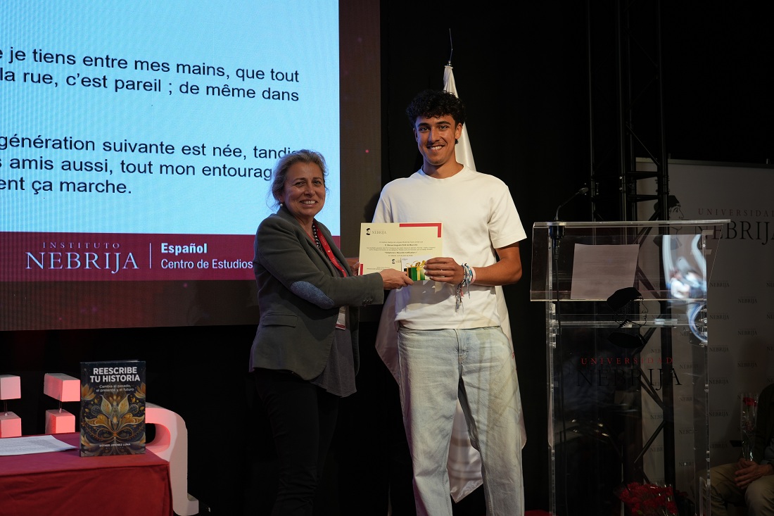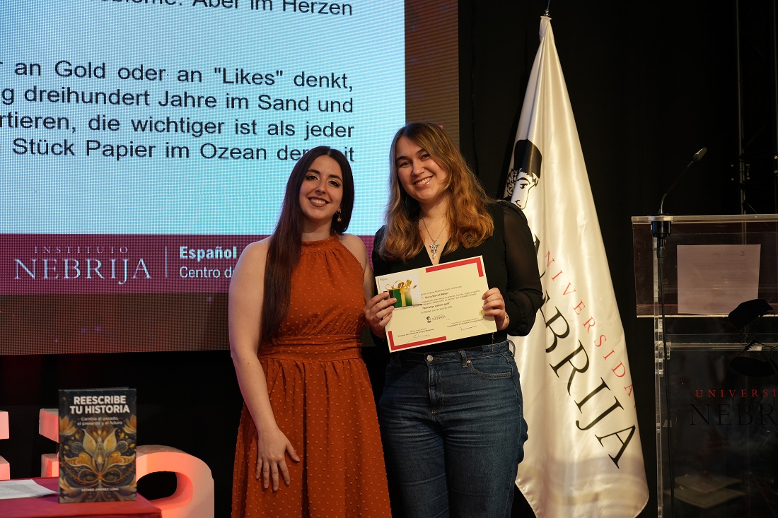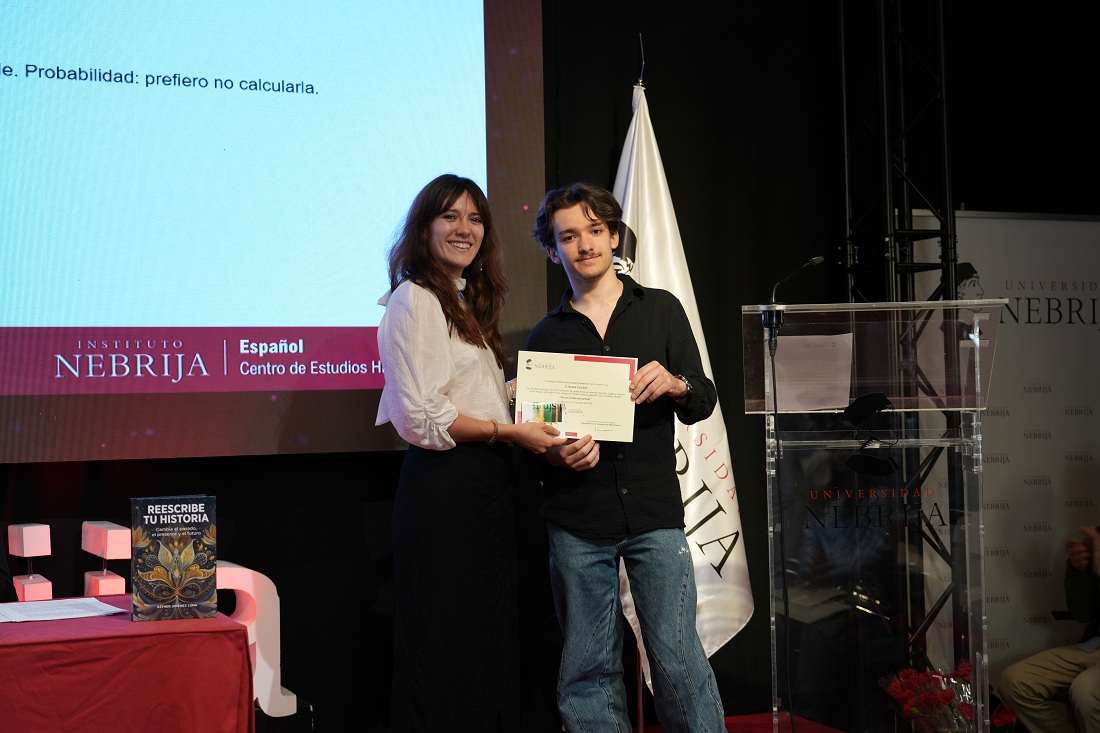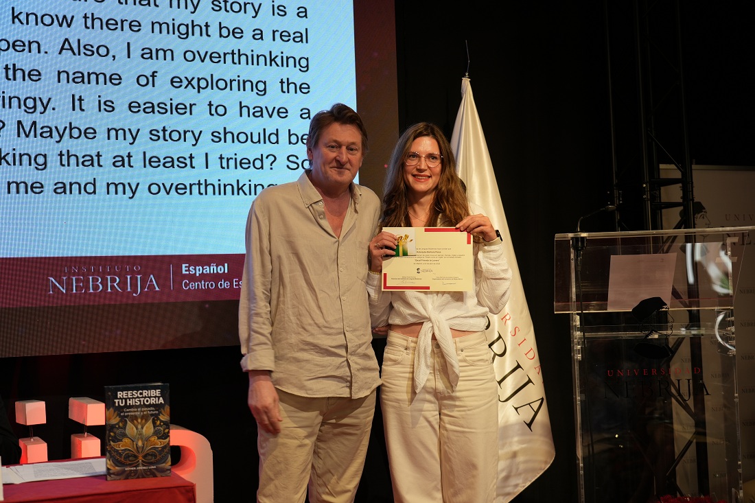 Melisa Teves, directora del Instituto Nebrija de Lenguas Modernas y otra amante de los libros, procedió a la entrega de los premios a los galardonados en el XVII Certamen de Relato Breve. “Necesitamos las palabras en tiempos en los que resulta más fácil perder el rumbo y somos arrastrados por el ruido. La literatura acude al rescate cuando nos sentimos débiles”, precisó.