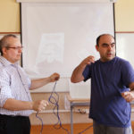 En lo que él llamaba “cacharrear con experimentos”, y siempre con materiales caseros, mostró cómo “yo puedo sacar mi coche del agua pero tú tienes que llamar a la grúa”, mientras multiplicaba, mediante las leyes de la polea, su propia fuerza frente a la de los alumnos, “muchos más cachas que yo. Y puedo con dos”. Hacer el vacío para conservar alimentos sin una bomba de vacío cara ni bolsas especiales sino con un recipiente lleno de agua, bolas de congelados y las leyes de Pascal, partir cuerdas sin cuchillos gracias al rozamiento y encender fuego sin cerillas mediante a una pila eléctrica, hilo de hierro y papel higiénico, “ese gran amigo”, fueron algunos de los experimentos que Javier Fernández Panadero llevó a cabo.