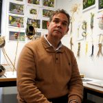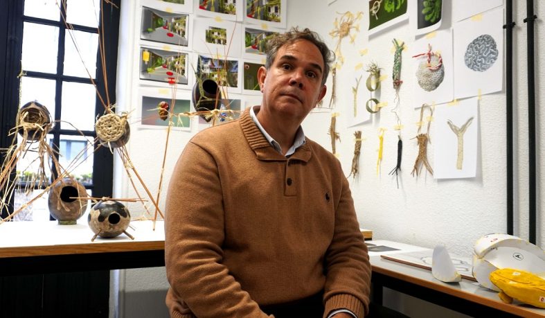 Respuesta: La estancia en Nebrija para mí es muy importante porque aterriza en un contexto madrileño, diferente al que he venido trabajando. Justamente la obra tiene que ver con esto, con uno seres que se trasladan en el tiempo y llegan a un Madrid diferente al que ellos esperaban. Son realmente viajeros en el tiempo, de millones de años, seres vegetales con cierto parentesco con las palmeras. Intercambiar experiencias con los estudiantes es un elemento relevante. El proyecto es sobre todo multimedia, parte de culturas casi neolíticas, llega al arte digital -modelación, proyección con vídeo mapping y audiovisual- y tiene un gran nivel de complejidad. Creo que muchas veces el artista en su formación desdeña posibilidades de sistemas de representación que pueden ir a su favor. En este caso, el lado ecológico o ecosófico, que el arte está tratando en la actualidad, quiero anclarlo en la tradición pictórica española, que, en la colección del Museo del Prado, plasma la cestería. Me interesa abordar cómo puede intervenir la cultura en su relación con la naturaleza y en qué dimensiones. Las piezas las trabajo en una escala ergonómica. La artesanía, y en concreto la cestería, como modelo no ha tenido un gran roce con la alta cultura. Para mí, la cestería es el modelo en el que nos deberíamos relacionar desde la cultura con la naturaleza.