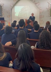 En esta institución mantuvimos una reunión con el gerente, rector, vicerrectora y encargados del DECE (Departamento de Consejería Estudiantil) y luego se procedió a realizar también la presentación Pasaporte al Futuro a un total de 200 estudiantes, entre 2º y 3º de bachillerato. Posteriormente también se presentó la Universidad Nebrija durante 10 minutos.