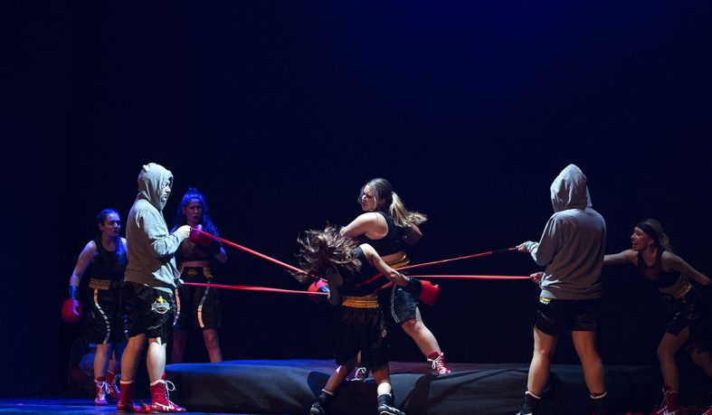 El múltiple uso de los guantes de boxeo, ora vaso, ora teléfono, ora el propio cántaro, y el ajustado tráfico de boxeadoras por el ring ofrecen otras dos de las claves más llamativas del montaje de Nebrija Escena.