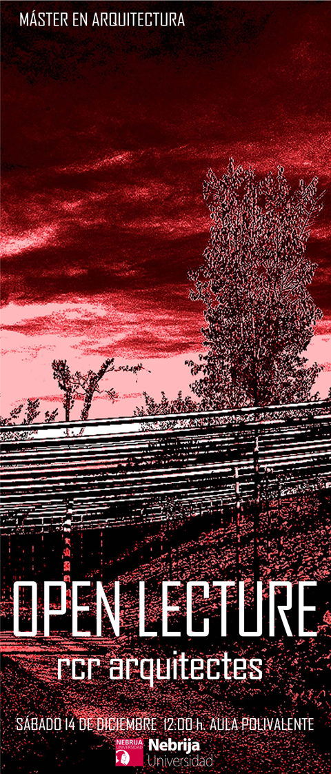 El próximo sábado, 14 de diciembre de 2013, a las 12:00h, RCR ARQUITECTES impartirá una conferencia inaugurando la serie OPEN LECTURE del Máster en Arquitectura de la Universidad Nebrija, en el aula polivalente.