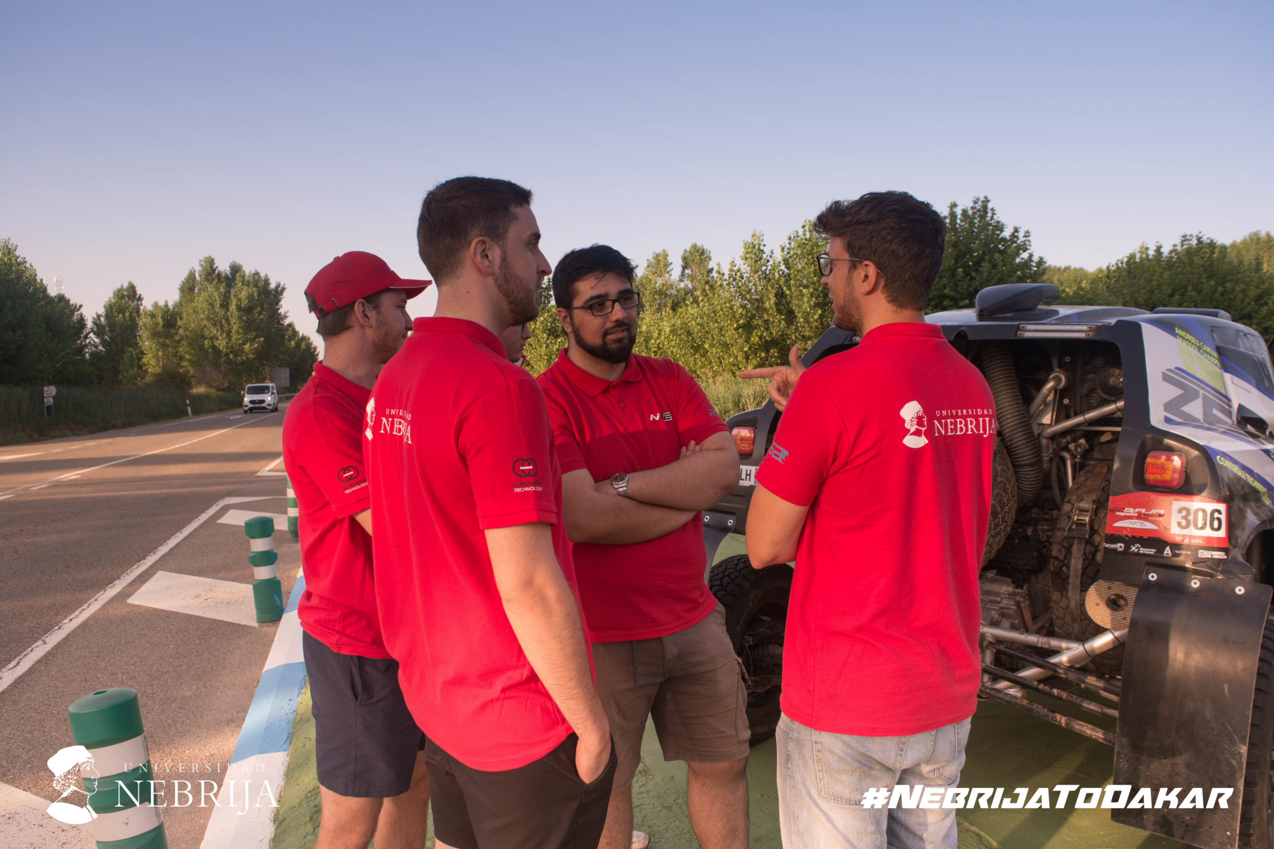 Los estudiantes de Nebrija que vivieron el fin de semana desde el epicentro de la acción no tardaron en darse cuenta de hasta qué punto ésta se puede impregnar de un tinte increíblemente hollywoodense. La pareja formada por Manolo y Marta Plaza, tripulantes a los mandos del BV2, mostró una adaptación gratamente rápida al vehículo durante la mañana del sábado, sección en la que se celebraron unas primeras especiales cronometradas zanjadas de forma distinta y ni mucho menos tan dulce como este primer presagio. Un súbito instante de confusión sobre el rumbo a seguir por parte de varios coches terminó en colisión frontal que dañó la dirección de nuestro protagonista. Así, la supervivencia se hizo imposible sin un primer apaño de por medio que, como mandan los cánones desérticos, terminaron haciendo padre e hija en pleno tramo, con el reloj corriendo y empleando únicamente los medios dispuestos a bordo del Sodicars. Tras ello, el esperado paso por la asistencia se tradujo en media hora de rápidos arreglos que, aun siendo insuficientes, propiciaron un arranque seguro para afrontar la sección vespertina. Con el ocaso del sábado todos deseaban ver y sentir lo que finalmente terminó produciéndose. La vuelta al parque sin nuevos percances dio paso a un turno de reparaciones en el que todos los integrantes del equipo (mecánicos, ingenieros, estudiantes…) arrimaron el hombro con efectividad, ejecutando orquestadas maniobras que dieron pie a un prometedor desenlace que se celebraría durante la mañana del domingo.