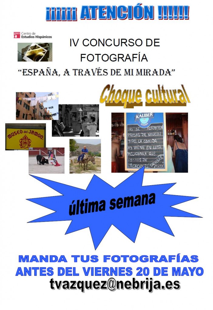 ÚLTIMA SEMANA del IV Concurso de Fotografía «España a través de mi mirada»: 18 mayo, 201127 octubre, 2015 agonzals Noticias y Eventos ÚLTIMA SEMANA del IV Concurso de Fotografía «España a través de mi mirada»