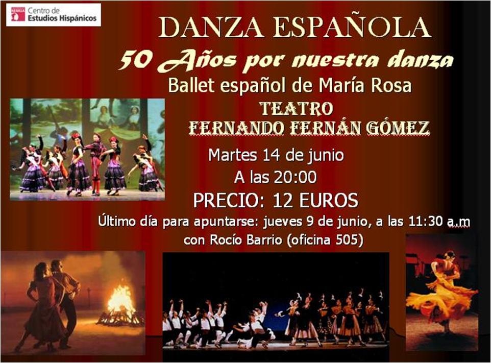 Los alumnos asistirán al Ballet español de María Rosa el próximo 14 de junio para ver un espectáculo de danza española titulado ’50 años por nuestra danza’. Los alumnos que deseen apuntarse a esta actividad pueden hacerlo en la oficina 505 del campus Dehesa de la Villa.