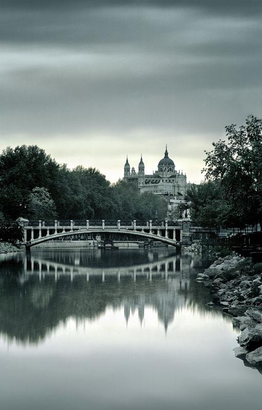 Puentes diversos cruzan el cauce del río Manzanares, coronados por la catedral de La Almudena. En Madrid Río conviven paseantes, turistas, deportistas, abuelos y nietos. Contiene infraestructuras para jugar al fútbol, al tenis, al pádel, al baloncesto, a la petanca, para practicar patinaje, escalada, ciclismo.
