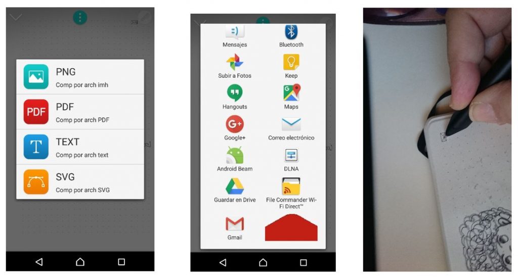 Después debemos sincronizar la pluma y la app, con lo cual mientras vamos escribiendo o dibujando en la libreta, esos trazos se ven en el teléfono (o tablet) al mismo tiempo: