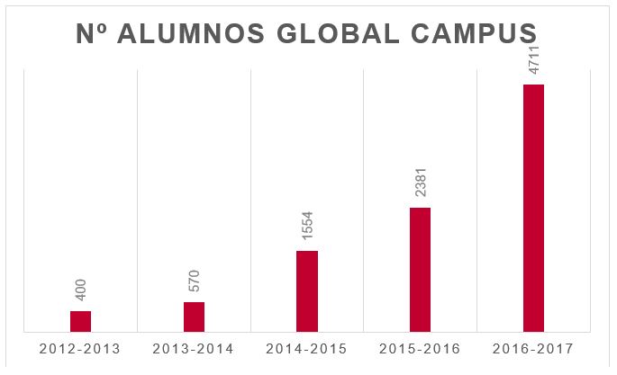 - Página web Global: Desde septiembre de 2016 han accedido al portal web de Global más de 27.000 usuarios únicos (un incremento superior al 166% respecto al mismo periodo del curso pasado). La página más visitada es la que contiene los programas online y blended de Global Campus.