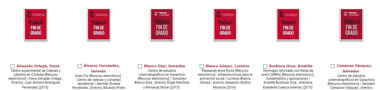 Imagen: Vista de resultados con la misma cubierta por idéntica tipología. Fuente: Catálogo-OPAC ~ Web Portal (Red de Bibliotecas Universidad Nebrija).