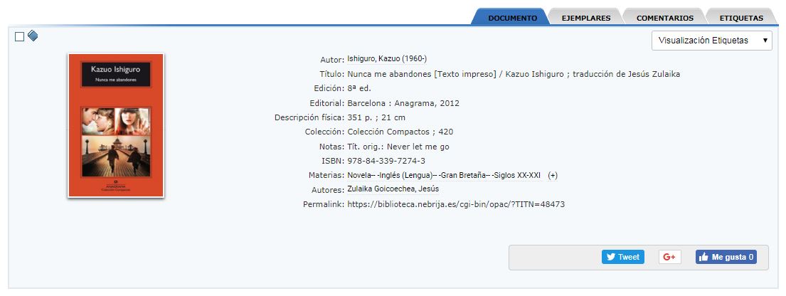Imagen: Vista de uno de los registros de la lista de resultados. Fuente: Catálogo-OPAC ~ Web Portal (Red de Bibliotecas Universidad Nebrija).