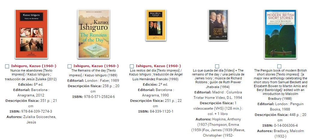 √ Mediante la vista de resultados en cuadrícula o lista que sucede a una consulta cualquiera: para cada resultado podemos contemplar la imagen de cubierta y, bajo la misma, los datos descriptivos básicos de la obra.