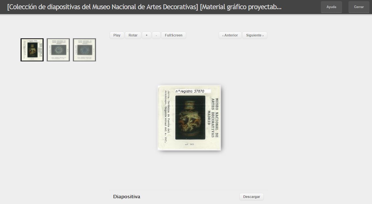 Tanto las cubiertas que se hayan subido desde la Red de Bibliotecas, como cualquier otra serie de imágenes relacionadas con los fondos bibliográficos que asociemos a estos, pueden visualizarse mucho más cómodamente –y con bastantes más funciones que la del simple visionado– a través del visor multimedia del Catálogo-OPAC ~ Web Portal, una herramienta que nos permite no sólo ver la imagen, sino aplicarle también una serie de efectos, como la rotación (la imagen rota de derecha a izquierda dando un giro completo de 360 grados a nuestra voluntad), la graduación de luminosidad, la vista en pantalla completa, la descarga o la proyección continua si se trata de una serie de imágenes. El visor multimedia se encuentra en la zona de enlaces multimedia del registro bibliográfico, junto a la función para descargar la imagen –por conversión– en un formato .pdf y la función para ver la imagen ampliada en pantalla sin necesidad de recurrir al visor multimedia. A continuación pueden verse un par de buenos ejemplos en los títulos Colección de diapositivas del Museo Nacional de Artes Decorativas y The Titanic disaster: as reported in the British National Press April-July 1912 de las colecciones bibliográficas.