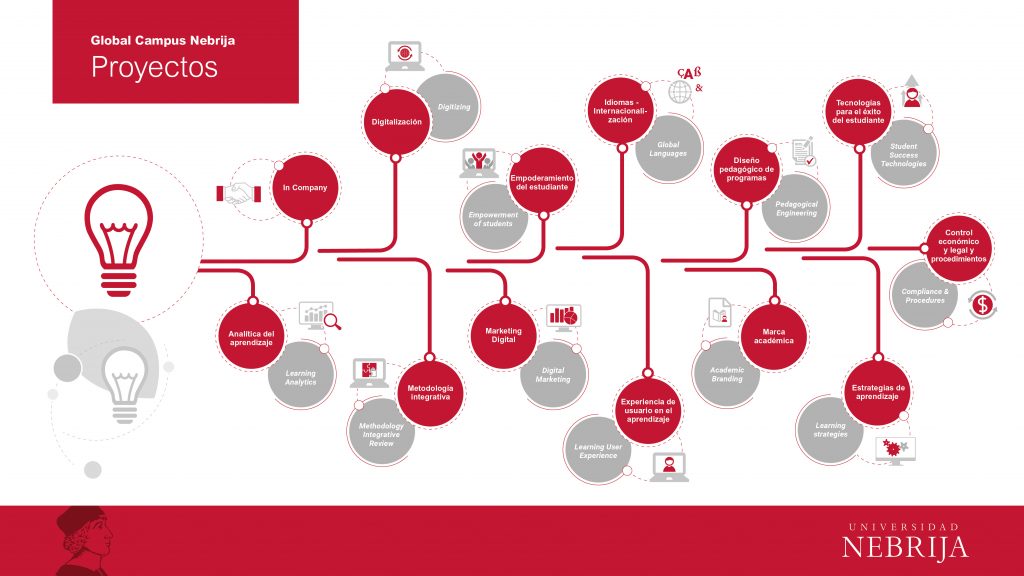 - Tecnologías para el éxito del estudiante / Student Success Technologies: Liderado por Natividad Reyes. Este proyecto incluye la formación de alumnado y profesorado, la generación de la comunidad educativa digital en Nebrija y el apoyo a diferentes eventos presenciales.