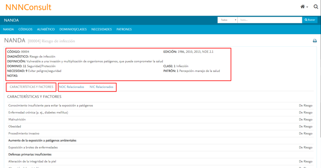 La ventaja de NNNConsult es que nos permite consultar las tres clasificaciones en un mismo lugar, pasando de una a otra sin dificultad y consultando asimismo las interrelaciones entre ellas. Estas interrelaciones (o vínculos) no están oficialmente sistematizadas aunque existe ya un corpus teórico que las respalda. Las que aparecen aquí están propuestas por el panel de asesores de Elsevier, a título no exhaustivo e incluidas a modo de sugerencias con fines educativos, o pueden provenir de la última edición de la obra de Johnson et al. Vínculos de NOC y NIC a NANDA-I y diagnósticos médicos. Estas últimas se encuentran marcadas con el icono