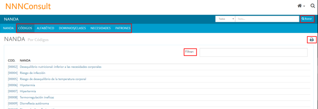 Así, por ejemplo, podremos acceder a los diferentes diagnósticos enfermeros de la clasificación NANDA por su código, por el orden alfabético del título de la etiqueta (o literal), agrupados por dominios/clases, agrupados según necesidades humanas básicas (Virginia Henderson) o agrupados por patrones funcionales (Marjory Gordon).