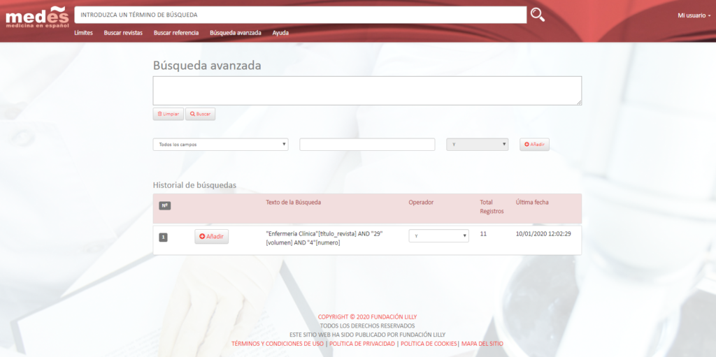 Imagen: Ejemplo de búsqueda en Enfermería clínica. Fuente: Medes