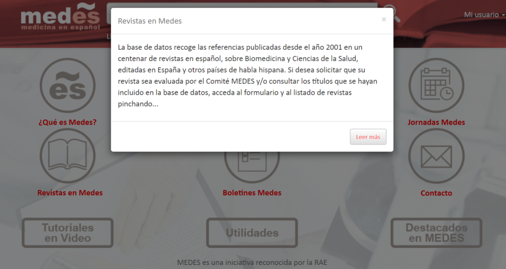 Sin más dilación continuamos con nuestra herramienta Medes. Medes es una base de datos referencial de acceso gratuito enteramente en español; una herramienta de consulta cuyas principales ventajas son la continua actualización y contenidos de calidad puesto que su selección es llevada a cabo por un Comité Asesor compuesto por reconocidos profesionales del mundo de la medicina.