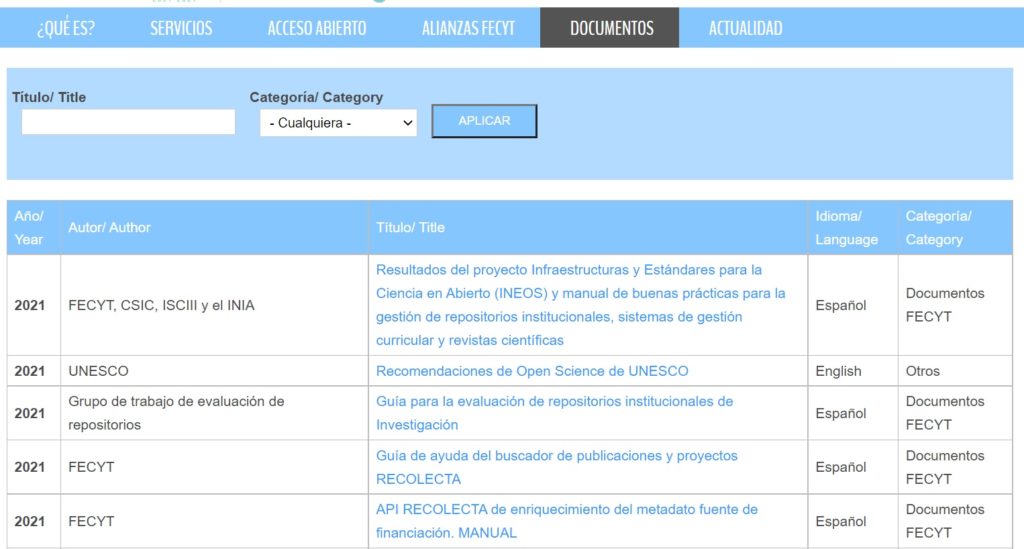Otras informaciones interesantes para completar nuestro paseo por Recolecta se encuentran en los enlaces del menú superior de la página principal, donde nos encontramos con la sección Documentos, que nos provee una selección de documentos útiles, entre otros, para el conocimiento del concepto Open Access y del concepto de ciencia abierta.