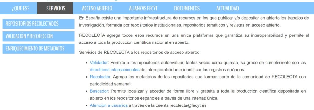 En la página de Servicios encontramos también información relacionada con el funcionamiento de los procesos de validación y recolección de datos, y sobre el enriquecimiento de metadatos, es decir, de los datos que componen los propios registros que se recolectan de los repositorios y nos permiten conocer, a través del buscador, los documentos y contenidos de la producción y actividad investigadora de las universidades, centros y organismos con presencia en Recolecta. Hallaremos igualmente información sobre la recolección de datos de investigación, esto es, aquellos datos (encuestas, gráficos, estadísticas, etc.) que han constituido la información fuente para elaborar las publicaciones como resultados de la investigación.