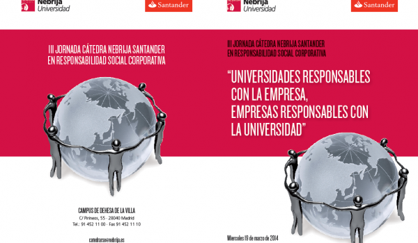 [Madrid, 18 de marzo de 2014]- La Cátedra Nebrija-Santander en Responsabilidad Social Corporativa celebrará mañana, miércoles 19 de marzo, su III Jornada, un punto de encuentro entre universidades y empresas sobre políticas de Responsabilidad Social Universitaria y Empresarial. Esta cátedra cuenta desde su creación con el apoyo de Banco Santander, a través de su División Global Santander Universidades, para todas sus actividades, entre ellas, esta jornada.