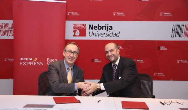 [Madrid, 12 de febrero de 2015.]- La Universidad Nebrija e Iberia Express han firmado un acuerdo marco de colaboración mediante el cual, ambas instituciones acuerdan cooperar en materia académica y profesional, para el desarrollo de becas y prácticas en la compañía aérea, colaboración en proyectos de investigación, convocatoria de concursos y premios entre sus estudiantes y descuentos en billetes de avión para sus alumnos, entre otras iniciativas.