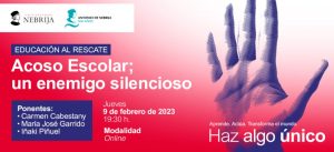 «Educación al rescate» es un proyecto organizado por la Universidad Nebrija que consta de un ciclo de entrevistas con profesionales de diferentes áreas de conocimiento, en las que se trata de dar respuesta a aquellas cuestiones más relevantes que en la actualidad pueden resultar controvertidas en el terreno de la educación. Para esta sesión, la temática seleccionada tiene el título «Acoso Escolar; un enemigo silencioso». Se hablará acerca de: