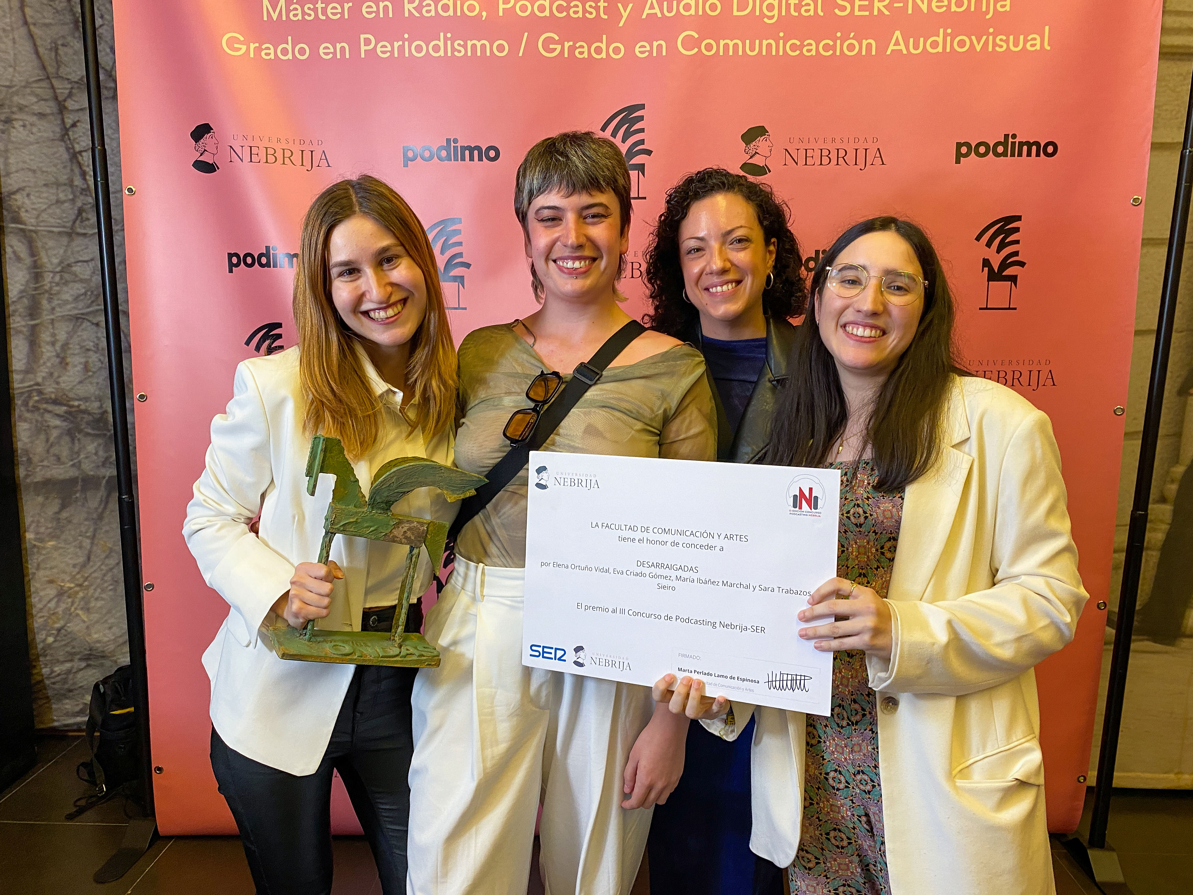 "Desarraigadas" es el proyecto ganador del III Concurso de Podcasting Nebrija-SER 2024. Una idea original llevada a cabo por Eva Criado, Elena Ortuño, Sara Trabazos y María Ibáñez que se adentra en las historias de esas mujeres inmigrantes que llegan a España a trabajar de manera ilegal. No son solo las historias de sus orígenes, sino la realidad del presente que viven en un país como España donde para tener acceso al estado del bienestar tienen que pasar por diferentes procesos que les hace sentirse sin arraigo.