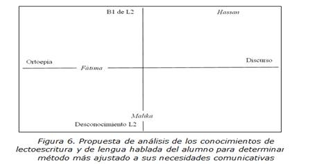 Por otra parte, mientras que una estudiante como Fátima necesitará, según nuestras previsiones, reforzar la parte ortoépica, sin olvidar por ello la discursiva, para afianzar concienzudamente la relación grafema-fonema y hacerse así consciente, poco a poco, de la importancia que tiene la escritura, un aprendiz como Hassan habrá de focalizar su atención en la competencia discursiva (Molina Domínguez, 2007; Polanco Porras, 2008), sin por ello dejar de recordar de vez en cuando la relevancia de la competencia ortoépica, y en mayor medida, de la competencia fonológica (Fernández Martín, 2009; Villa Carpio et alii, 2002).