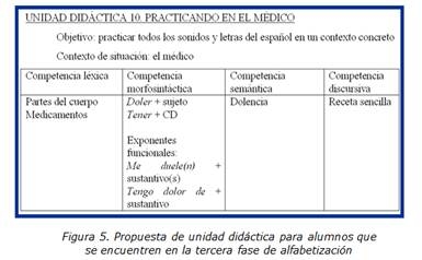 Por ejemplo, para un analfabeto adulto hablante nativo de español, la competencia fonológica resulta esencial a la hora de desarrollar la competencia lectora (Villa Carpio et alii, 2002), pero aquella puede constituir una dificultad en el caso de estudiantes extranjeros, porque puede estar plagada de fosilizaciones (como de hecho ocurre, cfr. apartado 3), que compliquen la actividad escritora. Para salvar este obstáculo, y sin olvidar jamás la importancia de la enseñanza de la competencia fonológica como motor previo a cualquier tipo de competencia escrita (Fernández Martín, 2009; Molina Domínguez, 2007; Villa Carpio et alii, 2002), se puede recurrir al desarrollo de otras competencias prediscursivas como pueden ser la léxica, semántica y morfosintáctica, que ayuden, a través del significado, a desarrollar la competencia fonológica para así avanzar en el proceso de alfabetización (cfr. infra).