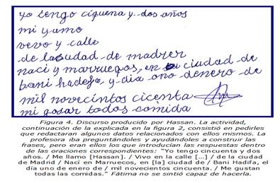 Desde la perspectiva productiva, a Hassan le resulta complejo redactar un texto breve por sí mismo, pero si se lo dictan es capaz de escribir frases que para él tienen pleno sentido (cfr. figura 4).