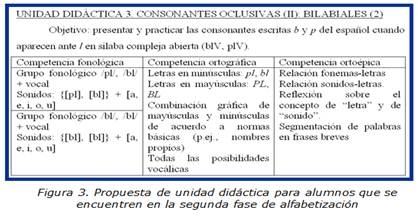 Creemos que para los alumnos que se encuentren en una fase semejante, se han de diseñar unidades didácticas que partan de la competencia fonológica y lleguen a la ortográfica a través de la ortoépica (cfr. figura 3; Villa Carpio et alii, 2002; Fernández Martín, 2009), sin dejar por ello de hacerlo de forma constructiva y eminentemente activa y significativ(Polanco Porras, 2008: § 2.4; Molina Domínguez, 2007).