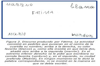 Desde la perspectiva productiva, Fátima es capaz de escribir palabras correctamente si le son familiares gráficamente, como es el caso de su propio nombre. Si conoce el término desde la perspectiva léxico-semántica, pero no conoce la grafía de la palabra, la escritura no llega a ser todo lo adecuada que debiera (cfr. figura 2). Si, finalmente, le son desconocidas, los dictados realizados por el profesor deben hacerse con insistencia sobre el orden en que los sonidos-fonemas aparecen en las palabras para que coloque de forma secuencialmente correcta cada grafema.