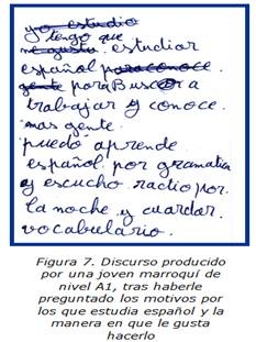 Se defiende oralmente en un nivel B1, aunque tiene numerosas fosilizaciones morfosintácticas y fonológicas. En nuestra clasificación previa (cfr. supra) se encontraría en el grupo b), dado que fue a la escuela en su país y domina perfectamente el sistema de escritura árabe pero, al haber aprendido el español directamente en la calle, su interlengua no ha sido objeto de reflexión, como ocurre, por lo general, si se asiste con asiduidad a clases de L2. Por este motivo, consideramos que se encuentra en la tercera fase de alfabetización, la denominada fase de procesamiento sintáctico y acceso al significado textual (Delgado Pérez, 2008: 40-41), que es, en realidad, una fase muy parecida a la de cualquier alumno alfabetizado que se acerque al estudio de una lengua extranjera.