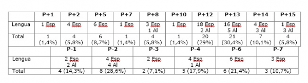 Lengua empleada | - | 2Esp | 1Esp | 2Esp 4Al | 1Al | 1Esp 2Al | 4Esp 3Al | 2Esp 2Al | 4Esp 3Al |