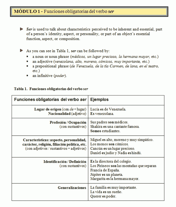 Tabla 1. Funciones obligatorias del verbo ser