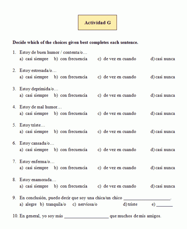 Estados | Físicos (con adjetivos) | ¿Cómo estás? Estoy enferma / cansada. Los platos están limpios / sucios. El vaso está lleno / vacío. |