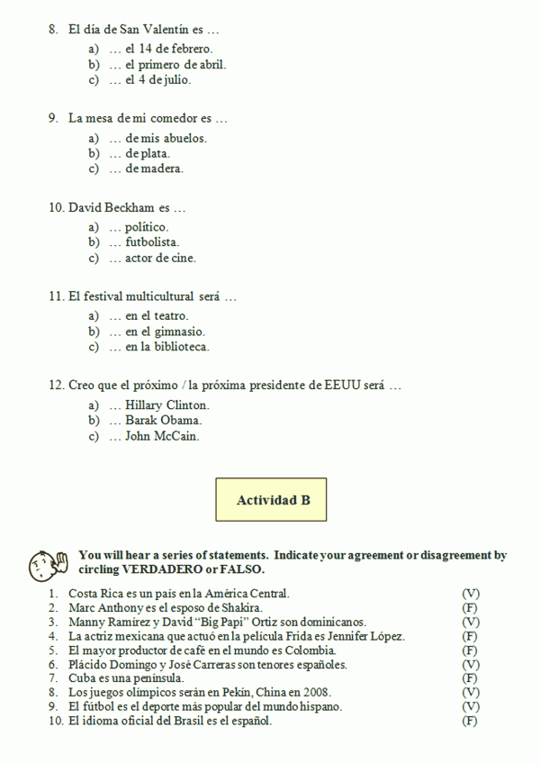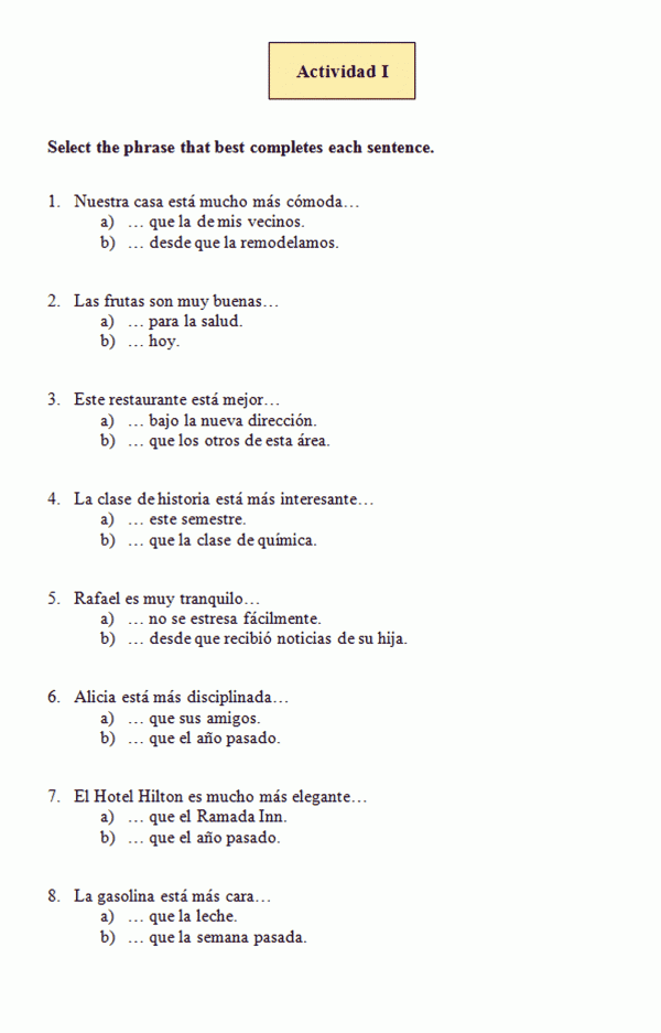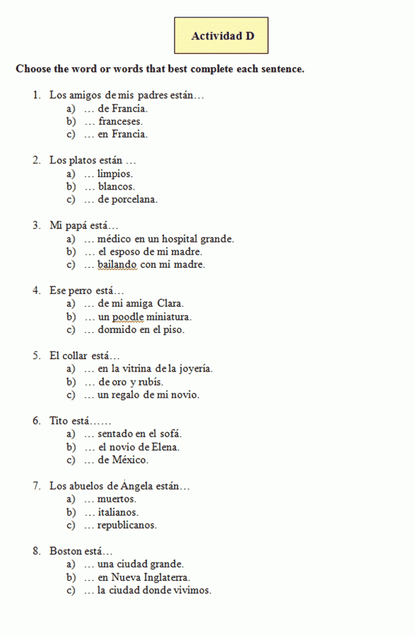 15. Es casado. He’s married. | Está casado con la prima de Luis. He is married to Luis’s cousin. |