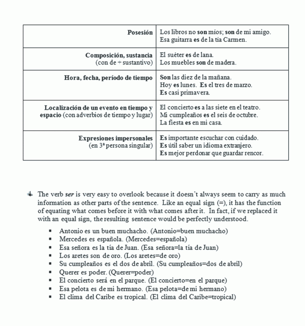 Se presenta ser como el verbo que se utiliza para expresar características inherentes y esenciales de un sustantivo (véase Tabla 1). Sus funciones son de describir, clasificar, definir, identificar, generalizar, localizar un evento en el tiempo o en el espacio, indicar la hora, fecha o un período de tiempo. Puede preceder un sustantivo, un pronombre o un sintagma nominal, un adjetivo, un sintagma preposicional o un infinitivo. Se utiliza siempre cuando hay un complemento que es un sustantivo o un pronombre y en expresiones impersonales.