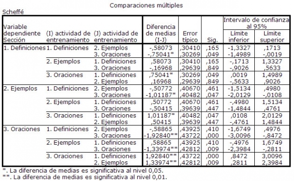 Ahora nos fijaremos entre qué actividades la diferencia es significativa al aplicar los procedimientos post hoc de comparaciones múltiples. Como muestran los resultados de la prueba de Scheffé en la tabla 3, en las dos secciones del postest en las que los estudiantes deben demostrar su conocimiento del vocabulario desde el punto de vista receptivo, es decir, la de selección de definiciones (Sección 1) y de ejemplos (Sección 2), es significativa la diferencia entre la media de los aciertos de los que se entrenaron seleccionando definiciones (Grupo 1) y la de los que practicaron con la escritura de oraciones (Grupo 3), con un nivel de confianza del 95% (en la tabla se indica con un asterisco). Las pruebas de Bonferroni y Tukey revelan las mismas diferencias significativas.