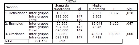 Por lo tanto, en los tres ejercicios del postest la diferencia entre el efecto del entrenamiento con la selección de definiciones (Grupo 1) y el de la escritura de oraciones (Grupo 3) es significativa; y en la actividad en la que los sujetos deben responder a la pregunta con una oración (Sección 3), el efecto del entrenamiento con la redacción y con la selección de ejemplos también produce diferencias significativas en el número de aciertos.