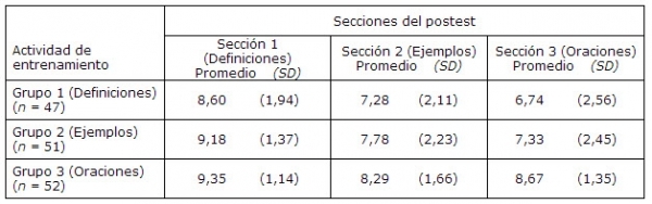 El análisis de los resultados obtenidos por los estudiantes en el postest teniendo en cuenta el entrenamiento realizado revela una diferencia significativa entre el efecto de la tarea de redacción (8,77 aciertos sobre 10) (Grupo 3) y el de la tarea de selección de definiciones (7,54 aciertos) (Grupo 1) "según el análisis de varianza: F (2, 147) = 7,631 p = 0,001; y las pruebas post hoc (Scheffé, Bonferroni y Tukey) confirman que la diferencia entre las medias alcanzadas por esos dos grupos es significativa, con un nivel de confianza superior al 95%: p = 0,001" (San Mateo Valdehíta 2012: 243-247). Por lo tanto, el entrenamiento con la actividad productiva es el más eficaz, ya que los sujetos que lo utilizan consiguen un mayor número de aciertos en el postest.