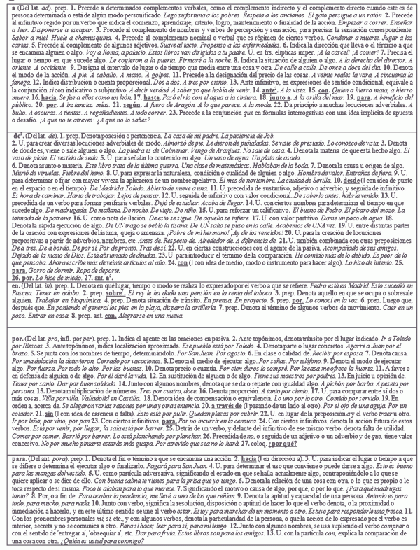 Las acepciones que el diccionario académico asigna a cada preposición, a pesar de ser numerosas, resultan siempre insuficientes por la variedad de contextos, relaciones y selecciones posibles. Por ej., las acepciones que se asigna a la preposición a (DRAE 2001: s. v. a) no cubren todas sus posibilidades expresivas. La acepción 23 de por (V. Anexo) supone una evidente contradicción incomprensible para el no nativo: la preposición por, que muchos manuales presentan como preposición de `causa´, tiene en este caso el valor de para, que se asocia a la expresión de finalidad. Para el alumno cada artículo puede constituirse en un enmarañado complejo de usos en el que le resulta imposible encontrar cierta unidad semántica a la que asirse para comprender el valor relacional básico de la preposición y poder utilizarla en otras situaciones comunicativas. Bastaría con que observáramos con ojos no nativos las acepciones que contienen los artículos del anexo, referidos a las preposiciones que el estudio de Campillo ha demostrado son el origen de un mayor número de errores, para comprender algunas de las razones de los mismos.
