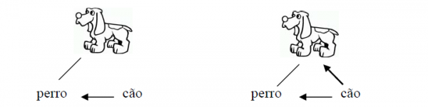 Volviendo al proceso de adquisición/aprendizaje, partimos de la evidencia de que el aprendizaje de una lengua extranjera o segunda (L2), en nuestro caso del portugués por aprendices hablantes de español, empieza con la proyección del léxico de la L1 en la L2, esto es, la L2 es “parasitaria” de la L1 (Alonso, 2012). En otras palabras, el aprendiz de L2 se sirve del conocimiento de su lengua materna (sistema solidificado, estructurado y organizado desde su infancia) para la construcción o desarrollo de la L2. De esta forma y haciendo de la L1 la base conceptual de la L2, el aprendiz, en la construcción de nuevas representaciones, atribuirá la nueva forma (“cão” de la L2) a los conceptos preexistentes de L1, esto es al concepto asociado a “perro”. La nueva forma se presentaría como otra manera de designar el concepto de la L1, esto es, cão sería otra forma de decir perro (Fig. 1), siendo el paso siguiente la conexión de enlaces directos entre la forma de L2 y el concepto (Fig. 2) (Alonso, 2012: 254).