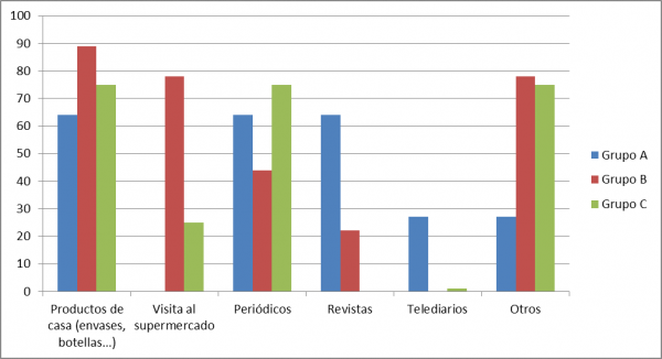 En general se verifica que mientras los alumnos del grupo A no optaron por buscar palabras en las visitas al supermercado, lo han compensado con la búsqueda en productos de casa, periódicos y revistas. Los alumnos del grupo B no optaron por los telediarios pero fueron los que más partido sacaron a las visitas al supermercado. Por último, los alumnos del grupo C no optaron por los telediarios y aún menos por las revistas, pero sí por los periódicos y la televisión en general (gran porcentaje en “otros”).