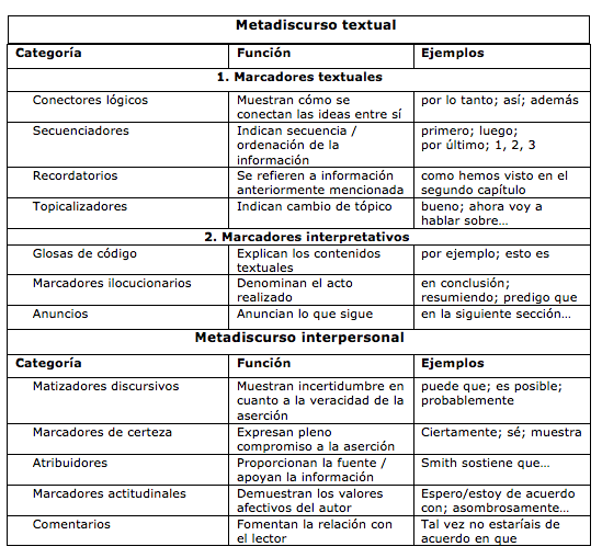 Si bien estos autores intentan implementar y desambiguar las categorías tratadas por Vande Kopple, se observan ciertas inconsistencias y confusiones en su modelo, especialmente, en lo relacionado al metadiscurso textual, donde se incluyen, por ejemplo, los recordatorios, que se refieren a información anteriormente mencionada, bajo la categoría marcadores textuales, mientras que los anuncios que informan sobre lo que sigue se catalogan como marcadores interpretativos. Asimismo, aunque definen el metadiscurso como material lingüístico que no añade nada al contenido proposicional del texto, sino que ayuda al lector a organizar, interpretar y evaluar la información presentada (Crismore y otros, 1993: 40), consideran los conectores lógicos que enlazan ideas entre sí como tal, basándose en criterios sintácticos.