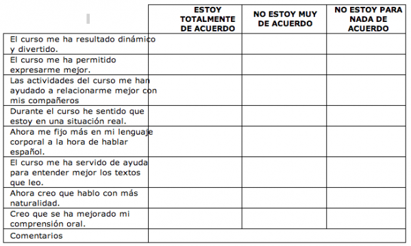 En este curso el profesor sirve de guía y va corrigiendo errores y comentando el tipo de estructuras lingüísticas usadas por los alumnos, a lo largo de los ensayos. Existe la posibilidad de grabar en vídeo las representaciones de cada grupo (Dorrego, L. 2006); de esta manera el estudiante va a ver no solo la corrección de su producción oral, sino también otros recursos expresivos como la forma de utilizar sus manos, su cuerpo, las inflexiones de su voz y la mirada entre otros.