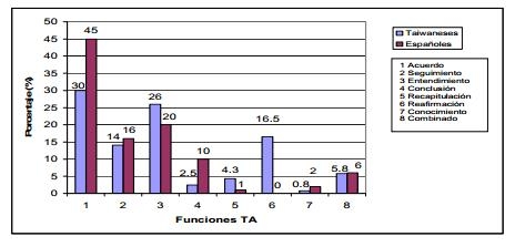 En nuestro corpus formado por seis conversaciones diádicas, realizadas por 12 alumnos universitarios taiwaneses en su cuarto curso de ELE, se han producido 335 turnos totales, 215 (64%) fueron turnos de habla (TH) y 120 (36%) TA. En un minuto se han dado un total de 9.5 turnos totales, de los cuales 6 fueron TH y 3.5 TA. En 18 ocasiones los TA sirvieron para iniciar el TH, lo que significa que el 8.4 % de todos los TH han comenzado por un TA. La media de TH y TA por conversación fue de 56 turnos totales, 36 TH y 20 TA. La tabla 1 desglosa los resultados mencionados.