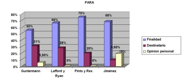 Por otro lado, la media de los valores correctos de todos los niveles de IL de para más significativos en los cuatro estudios analizados fueron finalidad y destinatario con una diferencia notable en el porcentaje por encima del resto. Existe, además, un porcentaje considerable de opinión personal en el corpus con italianos (19%). Sin embargo, el uso de este valor en el estudio de Guntermann (1992) es marginal, mientras que en los demás estudios con anglófonos es inexistente como podemos observar en el siguiente gráfico.